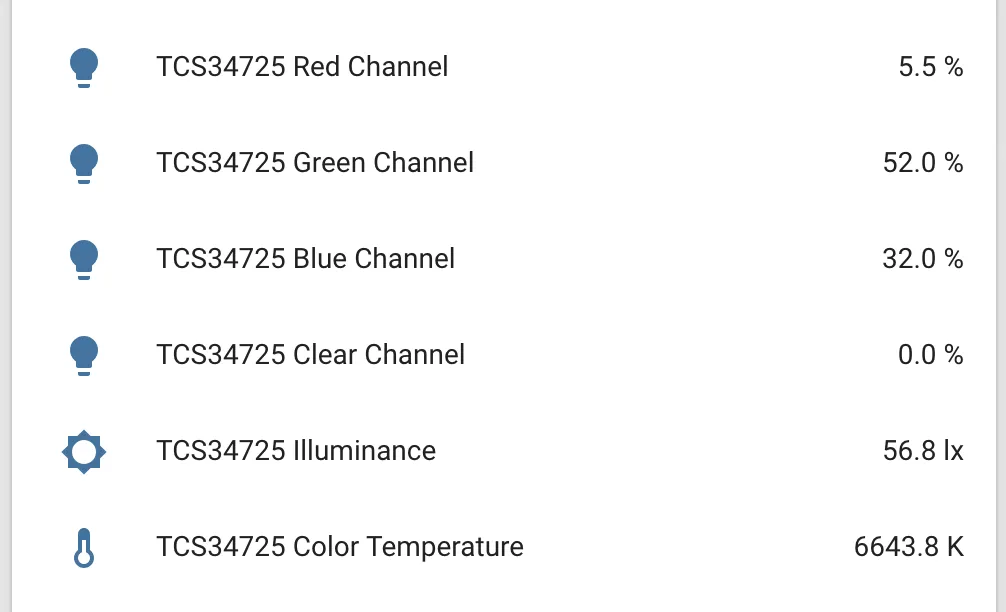 The tcs34725 sensor platform allows you to use your TCS34725 RGB color sensors (datasheet, Adafruit), color temperature and illuminance sensors with ESPHome. The I²C is required to be set up in your configuration for this sensor to work.
